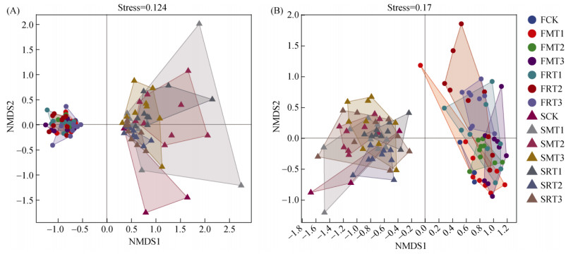 (A:细菌,B:真菌;图中每一个点为一个样本,不同颜色为不同的处理组,且按组进行连线,图中两点之间的距离反映样本间数据秩次信息的远近,可近似看成两个样本之间微生物群落的差异大小;横纵坐标轴无权重意义) 图 6 不同处理下细菌(A)、真菌(B)基于Bray-curtis距离的NMDS分析 Fig. 6 NMDS analysis of bacteria(A) and fungi(B) based on bray-curtis distance under different treatments |