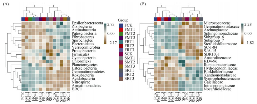 2.4 生物质炭添加对微生物种间差异的影响 2.4.1 生物质炭对细菌组成差异的影响微生物物种组成无论是在门水平上还是在科水平上,两个培养时期之间物种存在明显差异。图 7A门水平物种组成热图中,图上面部分的树图显示各个生物质炭处理均与FCK和SCK处理有较远距离,表明生物质炭的添加改变了土壤细菌群落的物种组成。黏胶球形菌门(Latescibacteria)、芽单胞菌门(Gemmatimonadetes)、棒状杆菌门(Rokubacteria)、酸杆菌门(Acidobacteria)、硝化螺旋菌门(Nitrospirae)、装甲菌门(Armatimonadetes)、BRC1等细菌门类在培养60 d时丰度较高;FMT1和FMT2、SMT1和SMT2处理均与其他处理聚类距离较远,其中SRT2和SRT3两处理中绿弯菌门(Chloroflexi)、放线菌门(Actinobacteria)丰度最高,而变形菌门(Proteobacteria)、厚壁菌门(Firmicutes)丰度最小。酸杆菌门(Acidobacteria)和硝化螺旋菌门(Nitrospirae)是在全部培养时期内变动最小的细菌门,且二者丰度水平较相近。图 7B科水平物种组成热图中,SRT2和SRT3处理之间差异较小且区别于另外的处理,这与门水平一致。丰度前20位的物种中,无论是门水平还是科水平,大约一半物种的丰度在培养60 d时较大,另一半物种在培养360 d时丰度较大。