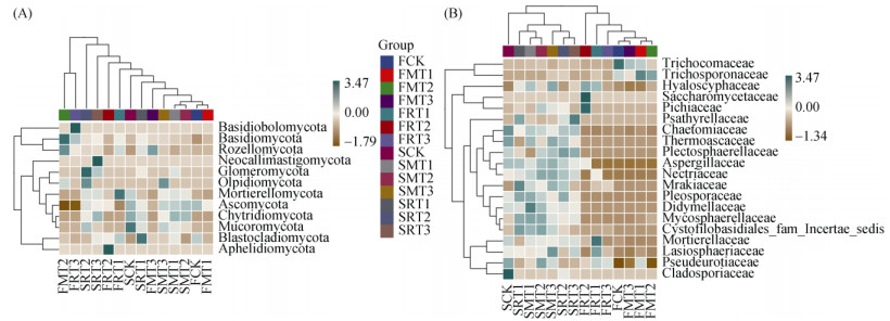 图 8 不同种类和裂解温度生物质炭添加下真菌门水平(A)和科水平(B)物种组成热图 Fig. 8 Heat map of species composition at fungal phylum (A) and family (B) levels with biochar addition at different pyrolysis temperatures |