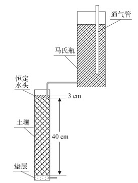 1.2.2 hs032添加对土壤溶质弥散能力的影响1) 土壤溶质穿透曲线。土壤中存在过量的Na+将会造成土壤水稳性团聚体解体、产生离子毒性,造成土壤结构、理化性质、生物活性的退化[13],因此此次试验主要监测土壤对Na+的弥散能力。试验采用室内恒定水头一维有机玻璃土柱进行,有机玻璃柱高50 cm,内径10 cm,装土40 cm。将1.2.1中培养30 d后的土壤按照每组最后测得的容重进行土柱装填,层间刮毛。采用马氏瓶供水,饱和土壤用蒸馏水,示踪剂选用3 g/L的NaCl溶液。采用雷磁DWS-51型钠离子计测量溶液中Na+浓度。试验装置如图 1所示。