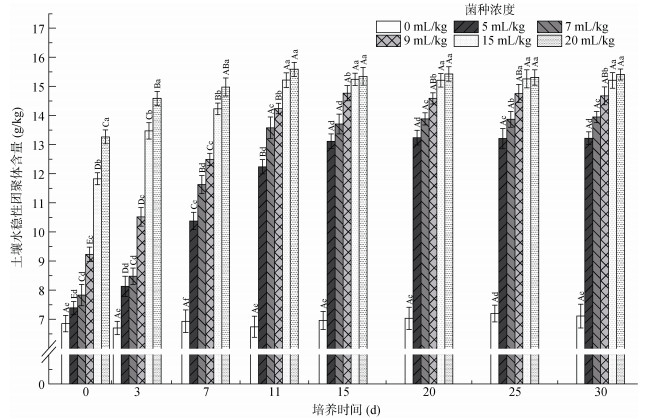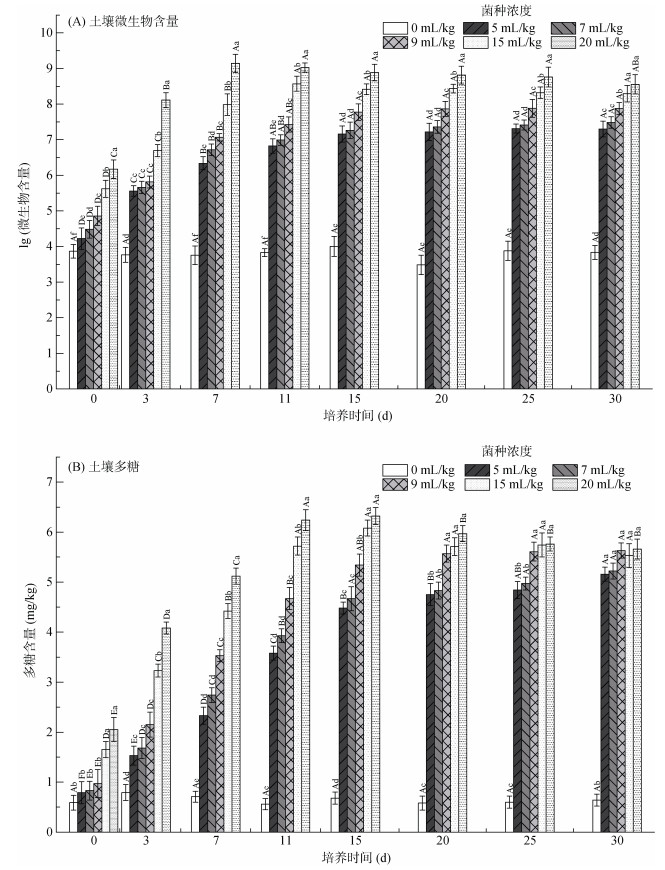 2.1.2 对土壤多糖含量的影响土壤多糖含量的变化趋势与土壤微生物含量的变化趋势相似(图 2B)。对照组多糖含量相对稳定,而各处理组显著升高(P < 0.05),并在培养11 d后先后达到最高水平。不同的是,菌液添加量为15和20 mL/kg两个处理组的多糖含量在达到最高水平之后开始缓慢下降,而其余各处理组15 d之前多糖含量快速增加,之后缓慢增加。至试验结束时(30 d)各处理组多糖含量已无显著差异(P > 0.05)。