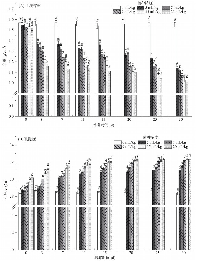 2.2 添加hs032对土壤理化特性的影响 2.2.1 对土壤容重和孔隙度的影响在为期30 d的试验期内,对照组的容重(图 3 A)和孔隙度(图 3 B)随时间的变化不显著(P > 0.05),而各处理组的土壤容重和孔隙度随时间变化显著(P < 0.05)。各处理组的土壤容重均呈波动下降趋势,较对照组的容重下降26.4% ~ 35.6%。菌液添加量为20 mL/kg处理组土壤容重降低最多,试验结束时为1.01 g/cm3。试验结束时菌液添加量为9、15和20 mL/kg 3个处理组土壤容重无明显差异(P > 0.05),但显著低于菌液添加量为5和7 mL/kg两个处理组(P < 0.05)。土壤孔隙度在混入菌液之后(0 d)就有了显著差别(P < 0.05),并且上升程度随着菌液添加量的增加而增加。菌液添加量较多时(15和20 mL/kg),土壤孔隙度变化趋势可分为2段:迅速增加和缓慢增加;而添加量较小时(5、7和9 mL/kg)孔隙度变化趋势可分为3段:缓慢增加、快速增加和缓慢增加,这可能与发酵液内含有不同量的胞外多糖有关。