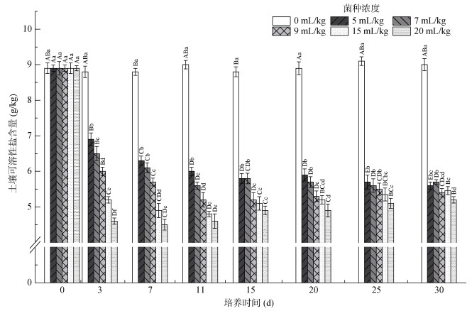 添加菌液使处理组土壤可溶性盐含量相对于对照组显著下降(P < 0.05,图 4)。各处理组在试验7 d之前均呈下降趋势,在7 d之后菌液添加量为15和20 mL/kg的处理组土壤可溶性盐含量开始缓慢上升,而其他处理组仍处在下降阶段,并且趋向于保持动态平衡。菌液添加量最多(20 mL/kg)的处理组在试验7 d时到达胞外可溶性盐含量的最低值(4.5 g/kg),在试验结束时为5.2 g/kg,相较试验初,下降41.5%。试验结束时各处理组土壤胞外可溶性盐含量无显著差别(P > 0.05)。