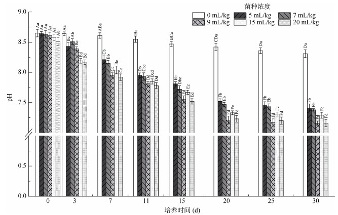 添加菌液的各处理组土壤pH整体呈先下降后平稳的变化趋势(图 5),在试验3 d之后相对于对照组显著下降(P < 0.05),下降幅度10.83% ~ 13.84%,且各组的下降趋势相似,均以试验20 d时为时间分界点,前20 d快速下降,下降幅度占总下降幅度的90% 以上,20 ~ 30 d下降速度减缓。其中下降幅度最大的是9 mL/kg菌液添加量处理组,pH范围8.61 ~ 7.16。试验结束时,9和20 mL/kg菌液添加量处理组之间,5和7 mL/kg菌液添加量处理组之间土壤pH无显著差异(P > 0.05),15 mL/kg菌液添加量处理组pH介于它们之间。