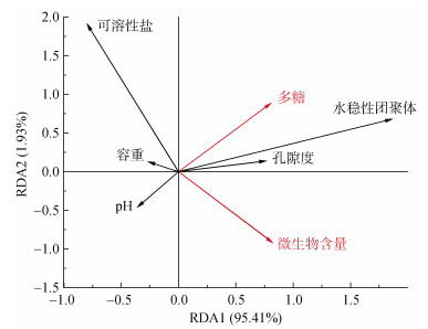 以土壤微生物含量和多糖含量为解释变量,土壤容重、孔隙度、可溶性盐、pH、水稳性团聚体含量为响应变量进行冗余分析(图 7),结果表明,冗余分析的第1和第2排序轴累计解释微生物特性对土壤理化性质影响的97.3%,表明这两轴可以解释微生物含量和胞外多糖对土壤理化性质影响的绝大部分信息。多糖含量和微生物含量与土壤水稳性团聚体含量、孔隙度呈正相关,与可溶性盐、容重和pH呈负相关。
