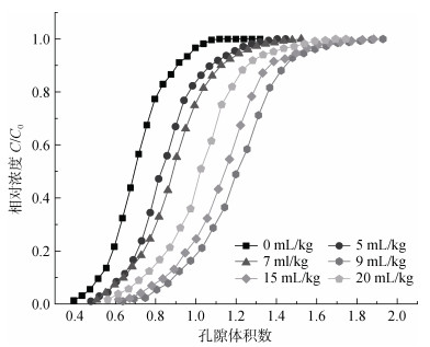 土壤溶质穿透曲线随菌液添加量的增加而右移(图 8),表示溶质穿透时间后移,添加菌液能够对溶质在土壤中的移动起阻碍作用。通过拟合S型曲线数学模型logistic 5,得到的参数如表 2所示,其中h与曲线斜率有关,h值越大表示曲线斜率越小。由拟合得到的参数h值得出,穿透曲线的斜率随菌液添加量的增加而减小,表明添加菌液可以使溶质穿透土柱所需时间延长。菌液添加量20 mL/kg处理组相较对照组穿透时间推后50%,完全穿透所需时间增加27.8%。并且,经试验测量处理组土壤孔隙水流速相较对照组增加4.5% ~ 39.6%,且随菌液添加量的增加而增加。经计算土壤穿透系数大小按菌液添加量依次为5 mL/kg > 0 mL/kg > 7 mL/kg > 9 mL/kg > 20 mL/kg > 15 mL/kg。