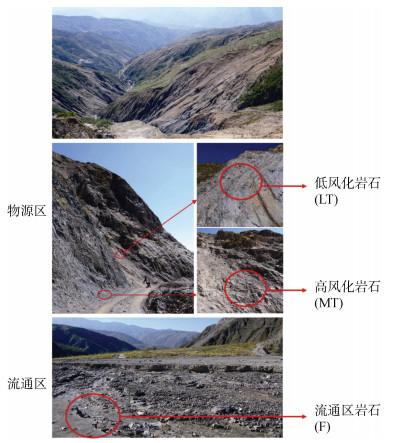 1 材料与方法 1.1 样品采集2014年10月于云南省昆明市东川区蒋家沟山谷变质板岩沉积区(20°14ˊN, 103°08ˊE)采集物源区低风化(LT组)和高风化(MT组)岩石样品以及流通区(F组)岩石样品(图 1)。岩石的风化程度通过肉眼观察进行判断。用95% 工业酒精表面消毒后的铲子收集岩石样品后装入无菌牛皮纸袋中。对于低风化的岩石样品,用表面消毒的锤子敲击岩石获得。每组岩石样品取3份重复。岩石样品收集后过2 mm筛,一部分用干冰保鲜运送回实验室后–80 ℃冻存以便后续提取DNA;另一部分岩石样品风干后常温保存以便后续进行理化性质分析。