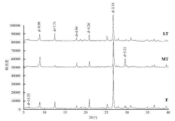 结合岩石形貌与XRD衍射分析,本研究所采集的岩石样品均为板岩,不同组板岩样品具有相似的矿物组分,主要包括蒙脱石、高岭石、黑云母和石英(图 2)。值得注意的是,仅在MT组岩石样品中发现了方解石的特征峰(d=3.21)。不同岩石样品的粒径占比如表 2所示,其中砾石的质量占比从高到低依次是LT组 > MT组 > F组,这表明3组板岩样品的风化程度由低到高依次是LT组 < MT组 < F组。