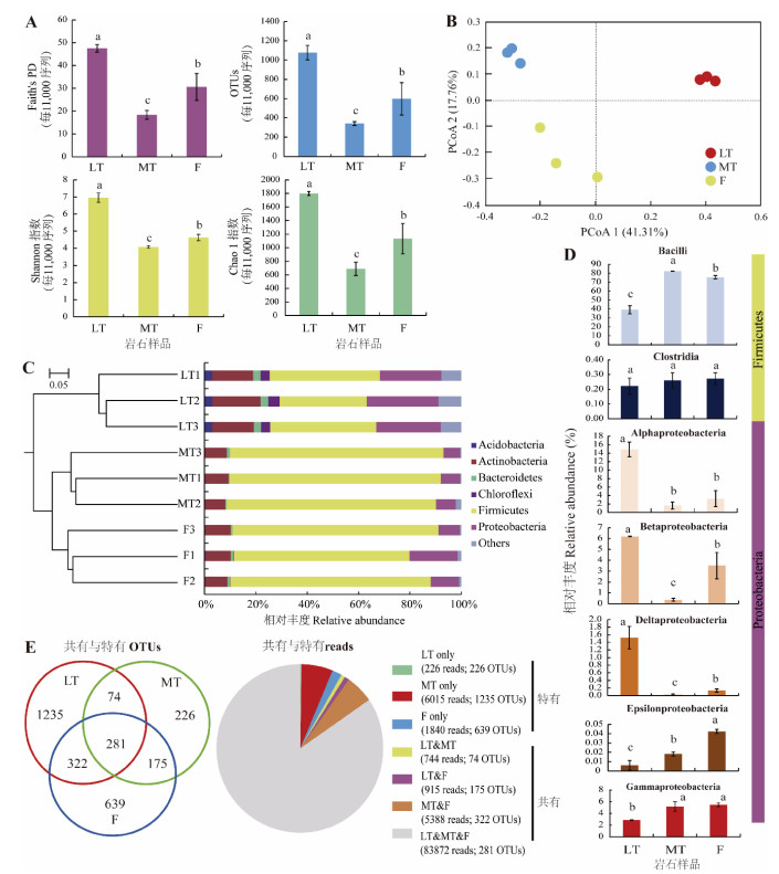 在门水平上,LT组岩石样品Actinobacteria和Proteobacteria菌门的相对丰度最高,其次是F组,MT组岩石样品中其相对丰度最低。不同岩石样品表生细菌菌群中Chloroflexi(绿弯菌门)和Firmicutes菌门的相对丰度由高到低分别为MT组 > F组 > LT组。不同采样点岩石表生细菌纲水平上的优势类群的相对丰度也有所不同(图 3D)。对于相对丰度最高的Firmicutes菌门,MT组中Bacilli(杆菌纲)的相对丰度最高,其次是F组,然后是LT组。
