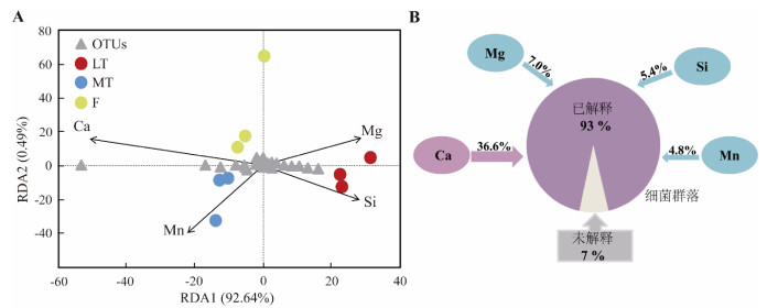 图 4 不同岩石样品表生细菌群落结构冗余分析(RDA)(A)及岩石样品中有效态Ca、Mg、Si和Mn含量对岩石表生细菌群落变异的解释度(B) Fig. 4 Redundancy analysis (RDA) of bacterial communities inhabiting slate rock sample surface, which depicts correlation between bacterial communities and rock properties (A) and variance percentages explained by studied rock properties (B) |