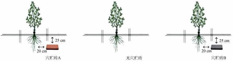 本试验采用单因素随机区组设计,共计3个处理:无穴贮砖对照(CK)、穴贮砖A处理(T1)、穴贮砖B处理(T2),每处理10个重复,共计30个试验小区。其他田间栽培管理措施均保持一致。试验于2021年5月10日进行,施砖时,对每株果树同一侧20 cm处,距土面25 cm处挖穴并施入一块果树穴贮砖(图 1),处理后统一安装滴灌带,将滴箭布置在果树穴贮砖正上方处,统一滴灌进行日常水肥供给。