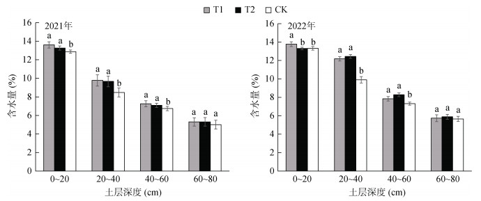 从图 10可知,随着土层深度的增加,T1、T2、CK处理下的土壤含水量均呈现出不同幅度的降低趋势。2021年在0 ~ 60 cm各土层,T1、T2处理的土壤含水量较CK均有显著提升,其中在20 ~ 40 cm处差异最为显著,分别提升了15.33%、14.03%;但在60 ~ 80 cm处各处理间无显著差异。2022年在0 ~ 20 cm处T1处理的土壤含水量显著高于T2、CK,其中T2相较于CK无显著差异;在20 ~ 40、40 ~ 60 cm处T1、T2处理较CK差异均显著,分别增加了23.03%、25.66% 和7.24%、13.11%;在60 ~ 80 cm处各处理间无显著差异。