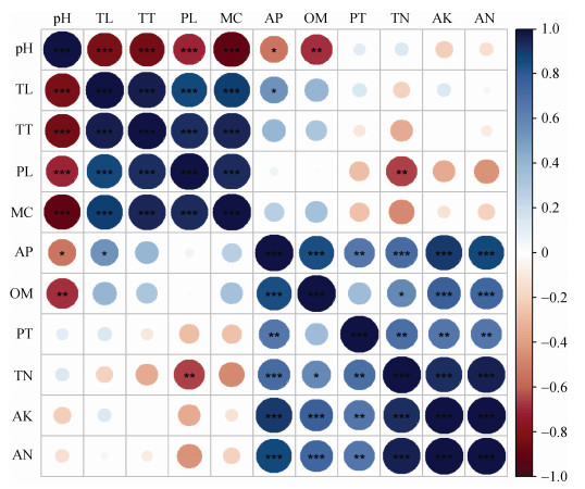 (TL为新梢长度, TT为新梢粗度, PL为叶柄长度,PT为叶柄粗度,MC为土壤含水量,AP为有效磷,OM为土壤有机质,TN为土壤全氮,AK为土壤速效钾, AN为土壤碱解氮。*、**、***分别表示相关性达P < 0.05、P < 0.01和 P < 0.001显著水平) 图 11 石榴新梢和叶柄的生长与土壤理化性质的相关性 Fig. 11 Correlation between growths of pomegranate shoots and petioles with soil physiochemical properties |