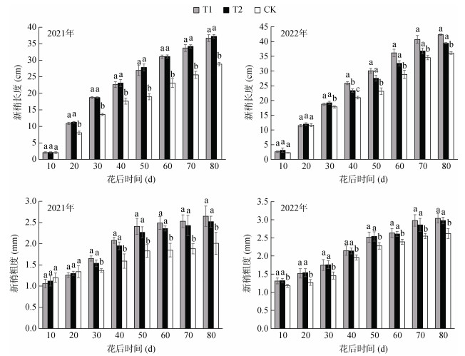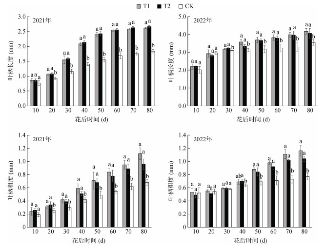 由图 3可知,与CK相比,两年试验T1、T2处理在花后80 d显著增长了石榴叶柄的长度和粗度,其中2021年分别增长了0.78、0.83 mm和0.44、0.28 mm,2022年分别增长了0.62、0.51 mm和0.39、0.27 mm,T1与T2处理间均无显著差异。此外,2021年T1、T2处理的叶柄长度和粗度在花后20 ~ 70 d均显著高于CK,而2022年T1、T2处理在花后50 ~ 70 d显著高于CK,且以T1处理效果较好,但T1、T2处理间差异均不显著。