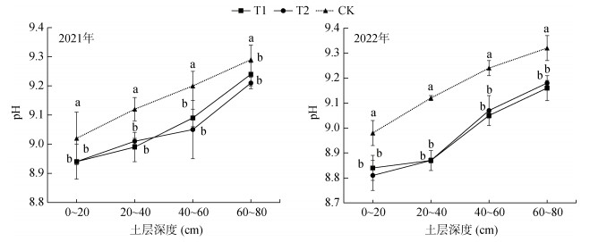 如图 4所示,两年试验施加两种果树穴贮砖均显著降低了0 ~ 80 cm各土层土壤pH。其中2021年在20 ~ 40 cm处T1处理的pH低于T2、CK,但在40 ~ 60和60 ~ 80 cm处均以T2处理的pH最低,分别比T1、CK减少了0.04、0.15和0.03、0.08;2022年在20 ~ 40 cm处T1、T2处理的pH较CK差异最为显著,均降低了0.25,在40 ~ 60、60 ~ 80 cm处各处理的pH均表现为T1 < T2 < CK。