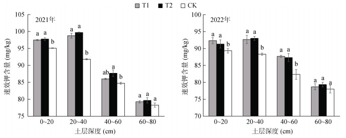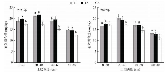 由图 5可知,随着土层深度的增加,CK处理的有效磷含量逐渐降低,而T1、T2处理则呈先上升再下降的趋势。2021年在0 ~ 80 cm各土层T1、T2处理的有效磷含量均显著高于CK,但T1与T2处理间均无显著差异,其中以20 ~ 40 cm土层处T1、T2处理的土壤有效磷含量最高,分别较CK显著提升了23.64%、26.13%;2022年在0 ~ 20 cm处T1、T2处理相较于CK无显著差异,在20 ~ 80 cm各土层T1、T2处理有效磷含量均高于CK,其中20 ~ 40 cm处T1、T2处理的土壤有效磷含量最高,分别较CK显著提升了18.85%、13.90%,且T1显著高于T2。