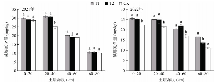 由图 7可知,两年试验在0 ~ 80 cm各土层,T1、T2处理较CK均增加了土壤碱解氮含量,且在20 ~ 40 cm处差异最为显著,其中2021年增加了22.97%、22.53%,2022年增加了16.88%、14.85%。此外,2022年在0 ~ 20、60 ~ 80 cm处各处理下的碱解氮含量表现均为T1 > T2 > CK,且T1、T2处理显著高于CK。