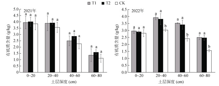 由图 8可知,2021年T1、T2处理0 ~ 80 cm各土层土壤有机质含量均高于CK,但未表现出显著性差异;2022年0 ~ 80 cm各土层土壤有机质含量均表现为T1 > T2 > CK,并且在20 ~ 80 cm土层T1、T2处理均显著高于CK,其中20 ~ 40 cm处T1、T2处理的土壤有机质含量最高,分别较CK显著提升了29.37%、25.74%。