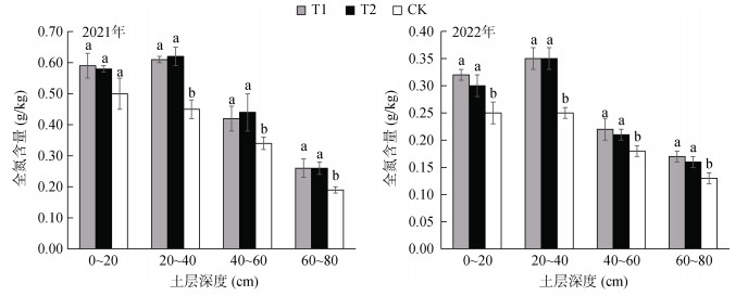如图 9所示,两年试验结果表明,随着土层深度的增加,CK处理下的全氮含量逐渐降低,而T1、T2处理则是先上升再下降。两年试验在0 ~ 80 cm各土层,与CK相比,T1、T2处理均提升了土壤中的全氮含量,且在20 ~ 40 cm处差异最为显著,其中2021年分别提升了35.56%、37.78%,2022年分别提升了20.44%、21.55%。
