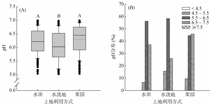 2 结果与分析 2.1 不同土地利用方式下土壤pH嘉兴市郊不同土地利用方式下土壤pH和分布见图 2。水田、水浇地和果园的土壤pH平均值分别为6.22、6.04和6.30,其中水浇地土壤pH显著低于水田和果园土壤(P < 0.01)。水田和水浇地土壤以微酸性(5.5 < pH < 6.5)为主,分别占56.19% 和58.33%,果园中性土壤(6.5 < pH < 7.5)比例略高于微酸性。3种用地类型中,水浇地的酸性土壤(4.5 < pH < 5.5)比例达到15.74%,是水田和果园的2.37倍和1.63倍。水田、水浇地和果园土壤属于微酸性和酸性的总和分别占62.83%、74.07% 和54.19%,由此可见3种用地类型有不同程度的酸化,其中水浇地利用方式土壤酸化最严重。