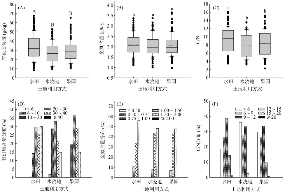水田、水浇地和果园的平均C/N分别为9.22、7.82和8.34(图 3C),且水田C/N显著高于水浇地和果园土壤(P < 0.05)。水田和果园C/N主要介于9 ~ 12,占比分别为38.94% 和33.55%;水浇地土壤C/N则 < 6占比最多(36.11%,图 3F)。水田、水浇地和果园土壤C/N≥12的比率分别为15.93%、2.78% 和10.32%。综上分析,水田土壤C/N总体水平高于果园和水浇地。