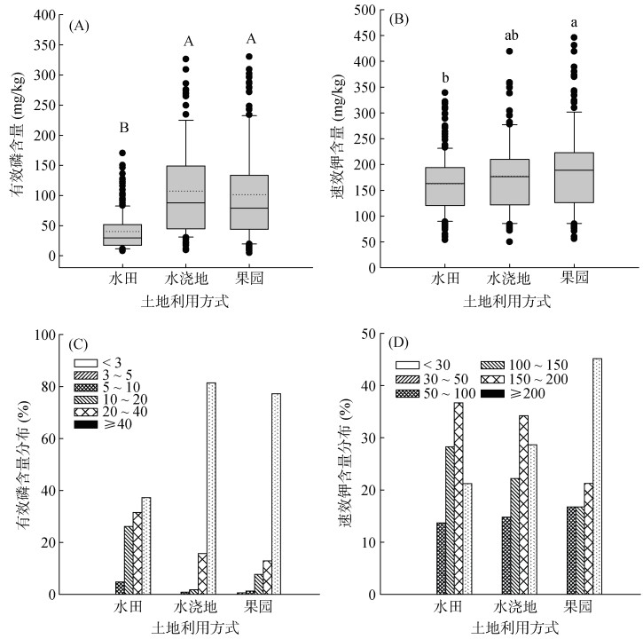 图 4B和图 4D为不同土地利用方式下土壤速效钾的含量和分布。结果显示,水田、水浇地和菜地土壤速效钾含量平均值分别为162.69、177.13和189.22 mg/kg,其中果园土壤速效钾含量显著高于水田土壤(P < 0.05)。从速效钾含量分布分析,水田和水浇地土壤类型速效钾含量主要分布于150 ~200 mg/kg,而果园土壤主要分布于≥200 mg/kg。由此可见,3种利用方式土壤的速效钾水平均处于较高水平,其中果园土壤钾素含量最高。
