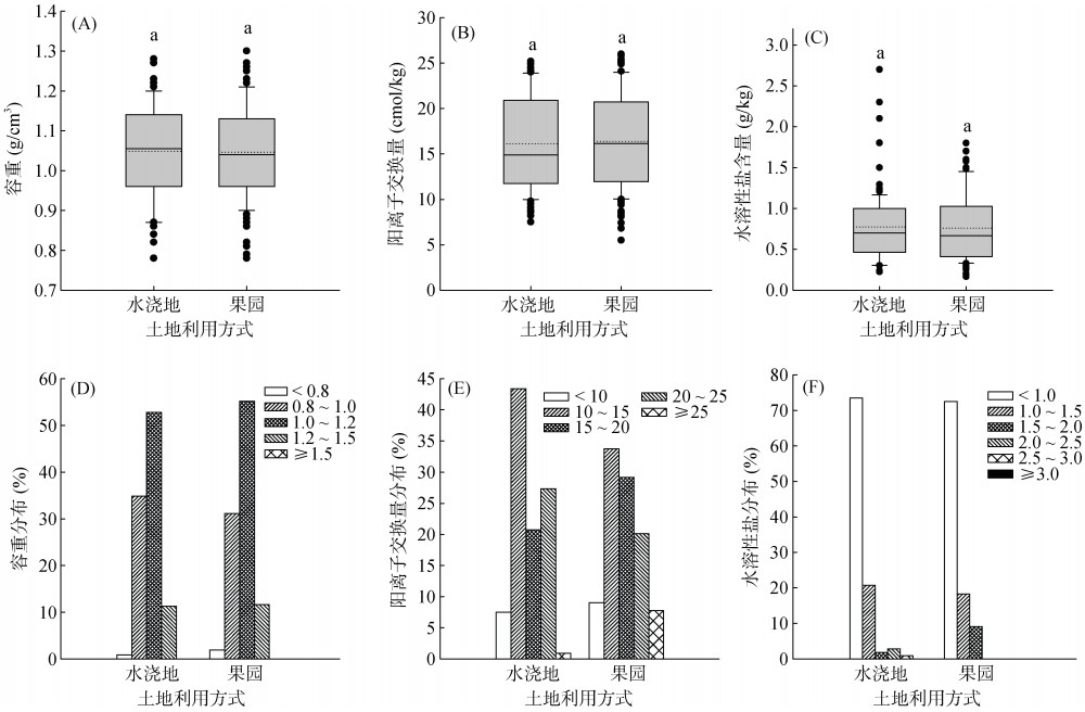 2.4 不同土地利用方式下土壤容重、阳离子交换量和水溶性盐含量水浇地和果园土壤容重平均值均为1.05 g/cm3 (图 5A),阳离子交换量平均值分别为16.14 cmol/kg和16.39 cmol/kg(图 5B),水溶性盐含量的平均值分别为0.77 g/kg和0.76 g/kg(图 5C),且均未发现显著性差异。从含量分布分析,两种土地利用方式土壤容重主要分布于1.0 ~ 1.2 g/cm3(图 5D),阳离子交换量均主要分布于10 ~ 15 cmol/kg(图 5E),水溶性盐含量主要分布于 < 1.0 g/kg(图 5F)。土壤水溶性盐含量1.0 ~ 3.0 g/kg为盐渍化土[7],本研究中,水浇地和果园的盐渍化土的比例分别为25.47% 和27.45%。