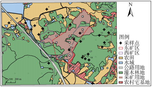 1 材料与方法 1.1 研究区概况与采样点布置本文以安徽省池州市“某矿区及周边区域土壤环境现状调查”项目数据为依托开展研究。该矿区位于长江中下游南岸、皖南山区北。原矿山地下分为东西两个开采区,东矿区为硫铁矿,西矿区为金矿。现西矿区已停止开采,研究区包含矿区和居民区、农田等,总面积为4.42 km2(图 1)。分别于2020年11—12月和2021年11月在研究区进行布点采样。以国家场地调查和场地环境监测的相关技术导则要求为前提,结合前期踏勘与资料分析结果,对开采区及周边敏感目标土壤污染情况进行调查;以东矿区周边1 km为监测区域,参照监测区域用地类型、淋溶水流向等进行布点;基于二分法原理对监测半径进行划分,在矿区排污口下游、贫液池上下游和矿区排污口等有污染源的地区加密布点;确保采样点的布置能够满足判别矿区及周边地块污染情况的要求,同时在现场环境条件不具备采样条件时,对点位进行调整,做到现场勘察与采样相结合[17],确定新的采样点位,用GPS记录坐标。鉴于前期调查发现西部地区整体地势较高,未受到本次项目区内淋溶水等污染的影响,因此在该区域未设置采样点。最终共采集表层(0 ~ 20 cm)土壤样品24份,点位分布见图 1。