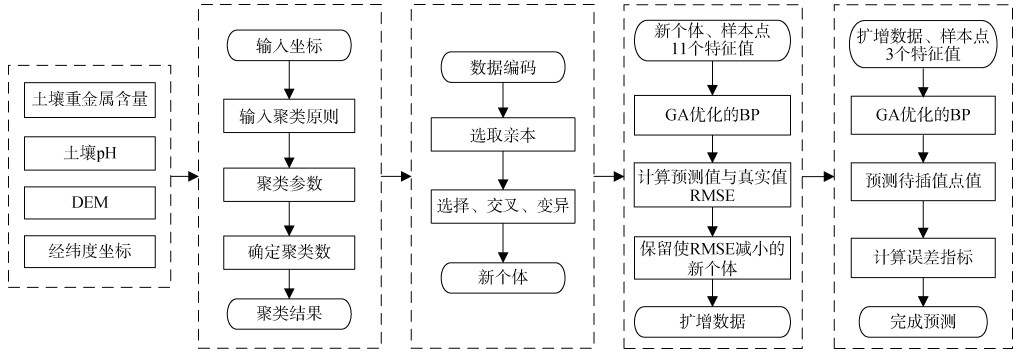 BP神经网络(Back propagation neural network,BPNN)模型建立过程需要大量训练样本进行学习,并使用测试样本进行验证。然而由于客观条件限制,有时很难获取足够的样本数据。样本数据不足可能会影响模型的准确性和可靠性。因此,在实际应用中,需要寻找其他有效方法来解决样本数据不足的问题,例如采用数据增强技术、合理选择特征等。Wang等[12]针对小样本数据进行表层土壤湿度反演存在的过拟合和目标任务欠拟合的问题,提出利用alpha近似方法对实测表层土壤湿度数据进行扩充,为机器学习模型提供更多的训练数据。尹光彩等[13-14]利用遗传算法(Genetic algorithm,GA)耦合ANN产生新个体实现空间插值,模型具有良好的预测性能,但其产生的位置具有随机性。戴倩倩等[15]和龚仓等[16]通过研究和收集关于地理探测器在土壤重金属空间分异领域的研究,发现高程差异对土壤pH和重金属空间分布和含量有显著影响。高程会影响土壤的湿度、类型、植被覆盖和雨水淋溶等,从而影响土壤重金属空间分布和含量。目前大多数关于GA和BPNN结合的研究只是利用GA可以收敛到全局最优解,来提高神经网络收敛速度、全局优化能力和学习能力。然而利用GA对小样本数据进行数据扩增,再耦合BPNN,结合平面坐标与高程因素对指定点来进行预测插值方面的研究鲜有报道。