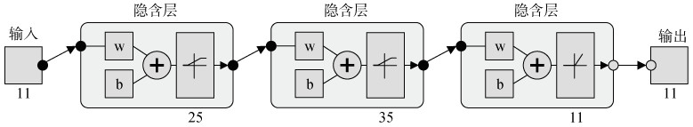 1) GA-EN评价网络。GA-EN的作用是在遗传算法每一轮产生新个体后计算新个体RMSE,决定其是否保留。合理设计BPNN结构可以使其具有较好的泛化能力,该神经网络结构(图 3)为:输入层和输出层各11个神经元,代表采样点的11个特征值;2个隐含层采用sigmoid函数;输出层采用的是正线性激活函数Poslin,在输入值不小于0时,输出值与输入相同,在输入值小于0时,输出0。在模型中,先将GA产生的新个体添加到数据集中,形成新的数据集;然后训练GA-EN,用GA-EN进行预测,得到预测结果;计算RMSE并根据其大小取舍新个体。