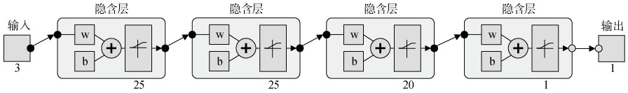 2) GA-PN预测网络。在训练集中,GA-PN模型采用k折交叉验证法来选择神经网络的参数,本研究采用了8折交叉验证(k=8)。通过这种方式,可以更准确地评估模型的性能,选择较好的参数组合。GA-PN模型基于前期数据扩增结果构建,用于预测研究区内其他位置土壤pH和重金属元素含量。该神经网络结构(图 4)为:输入层3个神经元,分别表示待预测点位的经度、纬度、高程;3个隐含层采用sigmoid函数;输出层1个神经元,表示预测点的某一种元素含量的预测值。