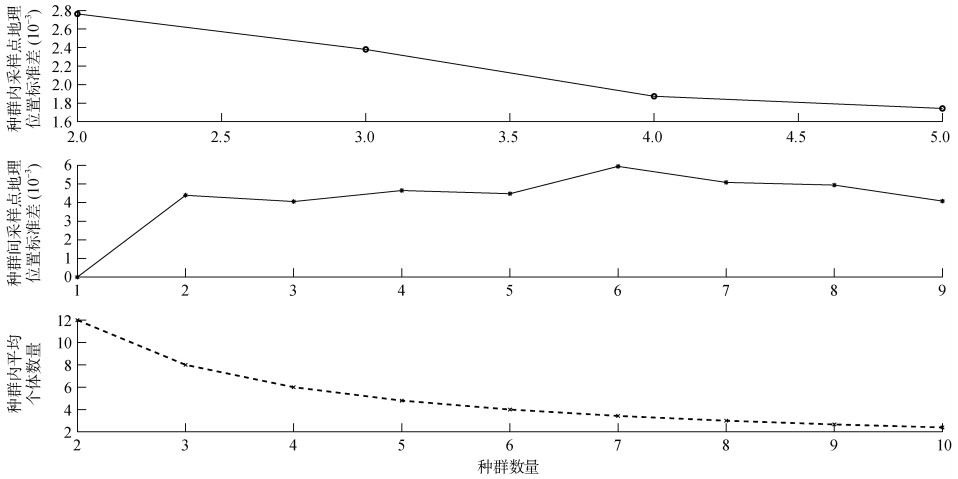 随着种群数量逐渐增加,观察到3个指标的变化逐渐减小或趋于稳定(图 5)。得出以下结论:当k=5,①种群内标准差逐渐减小;②种群间标准差逐渐增大;③种群内平均个体数量趋于稳定。因此,可以认为当k=5时,聚类效果最佳。