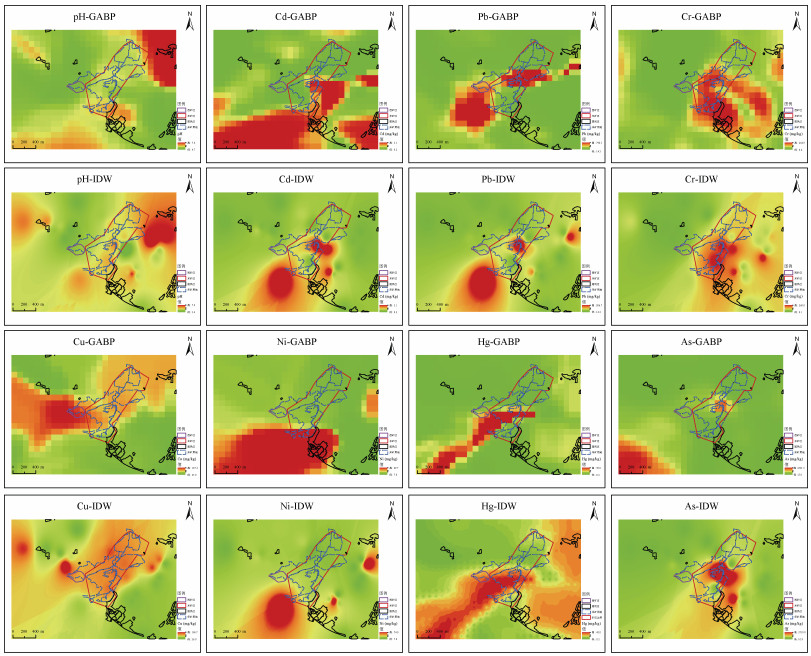 利用已知点的数据对未知点重金属元素含量进行空间插值可以快速得到整个研究区域的重金属分布状况。目前空间插值的方法主要有确定性插值方法,如反比距离权重法(Inverse distance weighting,IDW)、径向基函数(Radial basis function,RBF)、全局多项式插值(Global polynomial interpolation,GPI)等和地统计插值方法(如克里金法)两类[4]。曾星等[5]和张龙等[6]分别采用IDW方法和结合环境因子的克里金法对农田土壤指标的空间分布进行了分析。总体来看,确定性插值方法计算效率高,对于数据量充足且均匀分布的样本点,插值结果一般较为平滑,但对于非均匀分布的点,插值结果可能不够准确。地统计插值方法能够考虑空间数据的统计特性,更好地反映数据的空间变异性,提供插值结果的不确定性评估。但两种方法对于边界问题和异常值处理比较复杂,可能无法进行准确的插值[7]。
