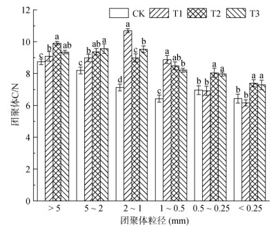 (图中小写字母不同表示同一粒径团聚体不同处理间差异达P < 0.05显著水平) 图 1 柑橘园土壤团聚体C/N Fig. 1 C/N ratios of soil aggregates in citrus orchards under different treatments |
