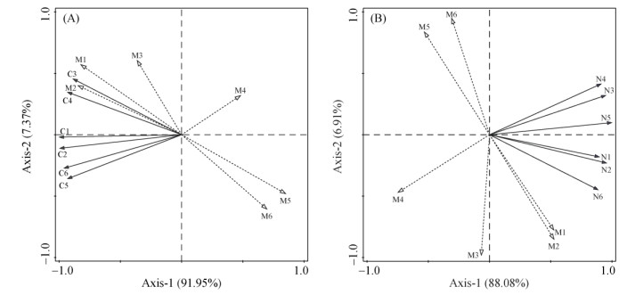 (M1 ~ M6、C1 ~ C6、N1 ~ N6分别表示 > 5、5 ~ 2、2 ~ 1、1 ~ 0.5、0.5 ~ 0.25和 < 0.25 mm团聚体的各粒径组成、有机碳和全氮含量;虚线箭头表示影响变量,实线箭头表示结果变量) 图 2 柑橘园土壤团聚体分布与有机碳(A)和全氮(B)含量间的冗余分析 Fig. 2 Redundancy analysis of soil aggregate distribution with organic carbon content (A) and total nitrogen content (B) in citrus orchards |
