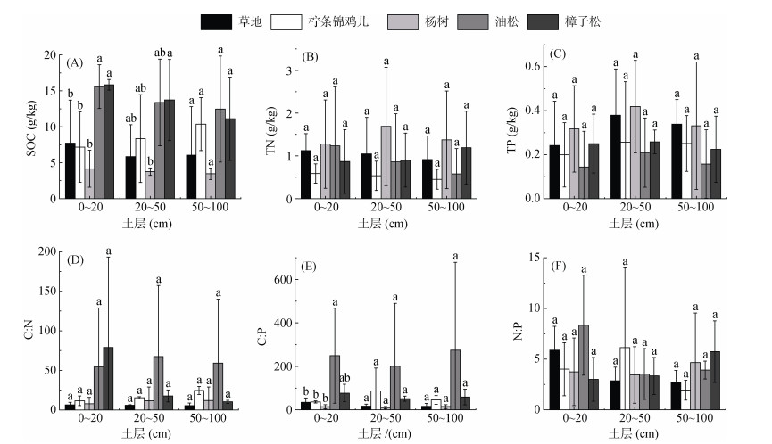 如图 1A,除杨树林地外,各人工植被类型下SOC含量均大于草地,表现为松树 > 柠条 > 草地 > 杨树。柠条林地在各个土层内的土壤TN含量低于草地(图 1B);杨树林地的土壤TN含量在各个土层深度中最高;其中,0 ~ 20 cm土层中,杨树 > 油松 > 草地 > 樟子松 > 柠条,50 ~ 100 cm土层中,杨树 > 樟子松 > 草地 > 油松 > 柠条。在各个土层中,只有杨树林的土壤TP含量高于草地,其余人工植被均低于草地,其中油松林最低(图 1C)。SOC、TN和TP在各个土层之间无显著性差异,但是SOC含量除了柠条外,均呈随着土层深度的增加而降低的趋势,而TN和TP含量无显著变化。