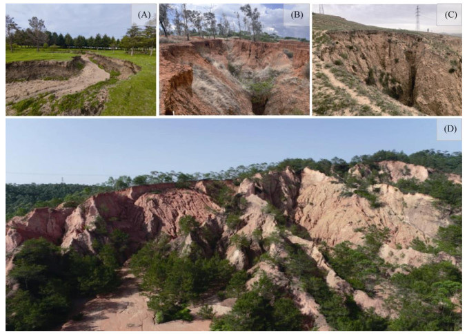 (A. 黑土区典型切沟侵蚀(邓羽松 摄);B. 干热河谷地区典型切沟侵蚀(张宝军 摄);C. 黄土高原典型切沟侵蚀(曾奕 摄);D. 广东德庆县崩岗侵蚀(邓羽松 摄)) 图 1 典型切沟侵蚀与崩岗侵蚀 Fig. 1 Typical gully erosion and Benggang erosion |