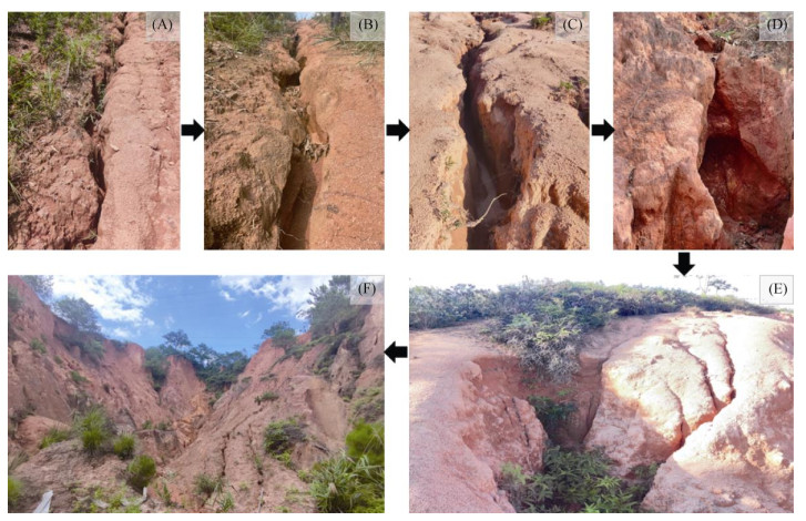 崩岗与典型切沟都可以经过溅蚀与面蚀进一步发育而来。水流因素主导着切沟侵蚀过程中沟头的溯源、沟底的下切及沟岸的扩张,推动着切沟不断发展。崩岗可以由面蚀发育而来,但并不是所有的面蚀最终都能发展成为崩岗,必须具备适当的气候、地质、地形等条件,一些崩岗是由坡面裸露的砂土层受单一重力作用下崩塌而形成的。