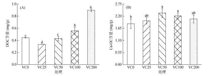 随着蚯蚓粪施用量的增加,土壤中Ca-OC含量呈先上升后下降趋势。在50、100 t/hm2施用量下,与对照相比,Ca-OC含量增加了26%、19%(图 1B)。