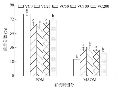 2.3 不同蚓粪施用量下土壤POM和MAOM的变化图 2表明,施用蚯蚓粪后,与对照相比,土壤中POM的质量分数呈现先下降后上升的趋势,各处理土壤中POM质量分数较对照下降了16%、20%、15%、10%。