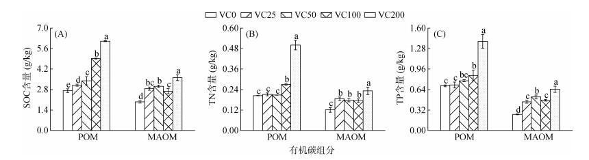 图 3 不同蚓粪施用量下土壤POM和MAOM组分中SOC、TN和TP含量 Fig. 3 Contents of SOC, TN and TP in soil POM and MAOM under different amounts of vermicompost |