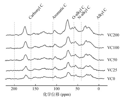 2.5 不同施用量下蚓粪对土壤有机碳官能团结构的影响图 4表明不同蚓粪施用量的土壤有机碳的核磁共振谱图形状基本一致,但各处理的化学位移峰的强度明显不同,说明土壤有机碳的碳骨架相似,但各种官能团的含量不同。