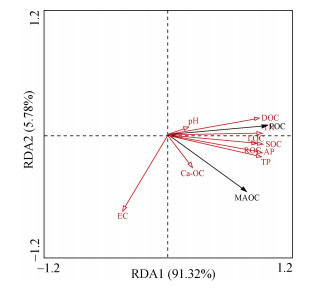 土壤有机碳库由植物源碳和微生物源碳两部分组成[27],POC主要来源于土壤中的植物源碳,MAOC主要来源于土壤中的微生物源碳[28]。最近的一项Meta分析表明:外源碳输入可以显著增加POC和MAOC的含量[29]。本研究结果与此一致,施用蚯蚓粪后发现POC和MAOC含量增加。这可能是因为蚯蚓粪中含有丰富的微生物群落,这些微生物通过分泌胞外酶分解或转化大分子植物碳底物向土壤源源不断地输送植物源残体[30],导致土壤POC含量增加;同时土壤中的微生物产物可驱动土壤植物源可溶性有机质和微生物源小分子有机物与黏土矿物结合,从而形成稳定的MAOC,微生物的死亡残体以及代谢产物的迭代累积也会促进MAOC的增加[31]。RDA1轴和RDA2轴(图 5)分别解释了有机碳组分91.32% 和5.78% 的变化,pH、DOC、LOC、TN、SOC、AP、ROC、TP、Ca-OC对POC和MAOC影响显著(P < 0.05),表明有机碳组分的变化受到土壤环境和土壤养分的影响较大。