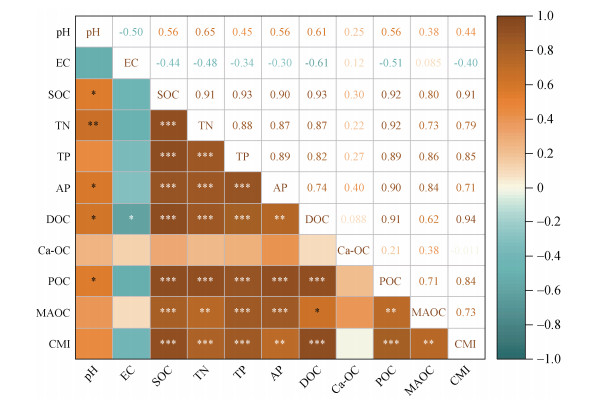 土壤碳库管理指数CMI是反映和评估土壤碳素动态变化的重要指标,可反映土壤碳库和土壤肥力质量的变化[40]。林晓钦等[41]研究发现蚯蚓粪的添加使得CMI是对照组的1.95倍。井大炜等[42]发现蚯蚓粪与化肥以不同比例配施能显著提高CMI。本研究施用蚯蚓粪后显著提高CMI的结果与上述研究一致。相关性分析(图 6)表明,CMI与AP、MAOC呈极显著正相关(P < 0.01),与SOC、TN、TP、DOC、POC呈极显著正相关(P < 0.001),说明CMI能较好地反映土壤养分以及土壤有机碳库组分的变化。