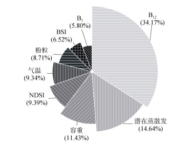 2.3.3 变量重要性计算RF模型各变量的重要性(图 2),结果显示,R因子对SOC估算贡献最大(39.97%),其次为M因子(23.98%)、S因子(20.14%)和I因子(15.91%)。其中,R因子中B12(34.17%) > B1 (5.8%),M因子中潜在蒸散发(14.64%) > 气温(9.34%),S因子中容重(11.43%) > 粉粒(8.71%),I因子中NDSI (9.39%) > BSI(6.52%),表明虽然上述变量均与SOC显著相关,但它们对估算SOC的贡献程度不同。重要性排名前4位的变量依次为B12、潜在蒸散发、容重和NDSI,累积贡献率达69.63%,它们作为4类因子的代表,是SOC估算的关键变量。