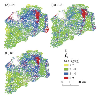 SOC分布受多重因素影响,往往表现为复杂的非线性关系[22]。相较于EN和PLS模型,RF模型通过构建不同决策树,并考虑变量间多种分割和相互作用,更能精确模拟非线性关系[23]。本研究表明,在样本点拟合、估算结果分布范围等方面,RF模型优于EN和PLS模型,与先前研究[24, 11]结论一致。