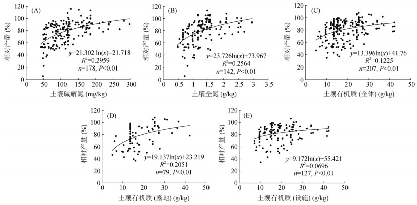 为最大限度地保证样本数量,以回归趋势线为参考,从总体数据中剔除个别明显偏离群体的数据后,建立我国土壤碱解氮、全氮和有机质含量与番茄缺氮处理相对产量回归方程如图 1所示。剔除离群数据后,分别利用178对和142对配套数据建立土壤碱解氮和全氮含量与番茄缺氮处理相对产量回归方程,2个回归方程均达到极显著水平(P < 0.01)。当土壤碱解氮和全氮含量范围分别为42.6 ~ 297.8 mg/kg和0.5 ~ 3.0 g/kg时,缺氮处理相对产量范围分别为5.9% ~ 115.7% 和5.9% ~ 113.2%。分别利用207对、79对和127对配套数据建立土壤有机质(全体)、土壤有机质(露地)和土壤有机质(设施)含量与番茄缺氮处理相对产量回归方程,3个回归方程均达到极显著水平(P < 0.01)。当全体、露地和设施土壤有机质含量范围分别为5.0 ~ 42.3 g/kg、5.0 ~ 42.1 g/kg和7.3 ~ 42.3 g/kg时,番茄缺氮处理相对产量范围分别为34.7% ~ 107.9%、37.1% ~ 107.9% 和34.7% ~ 106.3%。