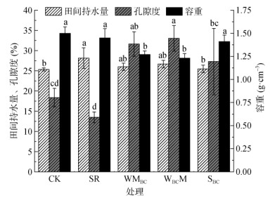 经过长期秸秆还田,土壤容重均有所降低。秸秆+生物质炭还田对土壤容重降低效果显著,各处理容重大小变化规律为:WBCM < WMBC < SBC < SR < CK(图 1)。WBCM、WMBC处理显著提高了土壤孔隙度,不同处理土壤孔隙度大小变化整体上与容重呈相反规律。秸秆还田提高了土壤田间持水量,SR处理田间持水量最高,WBCM处理次之。
