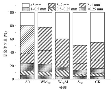 图 2结果显示,土壤团聚体以 > 2 mm为主,< 0.25 mm的团聚体含量最低。秸秆还田降低了土壤中 > 5 mm的团聚体含量(SBC处理除外),SR、WMBC处理效果明显。对于粒级5 ~ 2 mm的土壤团聚体,各处理含量大小依次为:SR > WMBC > WBCM > SBC > CK,与 > 5 mm的团聚体含量整体呈现相反的变化规律。图 2结果同样显示,WMBC处理土壤中 < 5 mm的团聚体分布较为分散,土壤结构较良好。