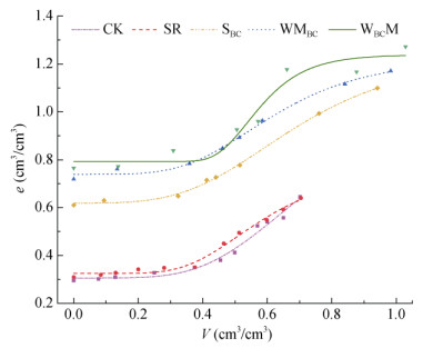 土壤收缩曲线如图 3所示。由图 3可见,随着土壤水分比(θ)及孔隙比(e)逐渐降低,土壤收缩曲线形状大致呈现“S”形,添加生物质炭处理的土壤收缩曲线明显高于未加生物质炭处理。土壤饱和孔隙比表现为:WBCM > WMBC > SBC > CK > SR;土壤残余孔隙比变化趋势整体上与饱和孔隙比一致,但SR处理残余孔隙比大于CK处理(表 3)。